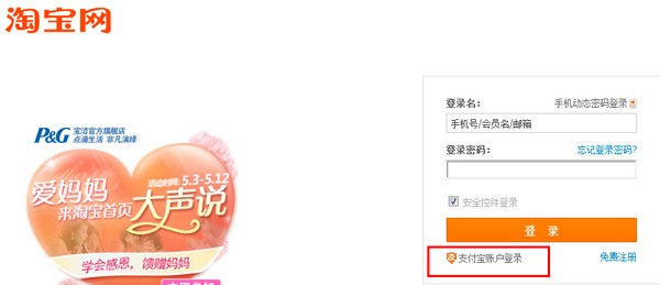 1 登录淘宝网(www.taobao.com), 点击左上方【登录】,若您已有其他阿里旺旺登录情况下,页面会显示已登录的账户,请点击快速登录下方的【使用其他账户登录】
