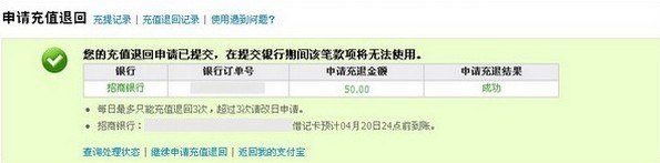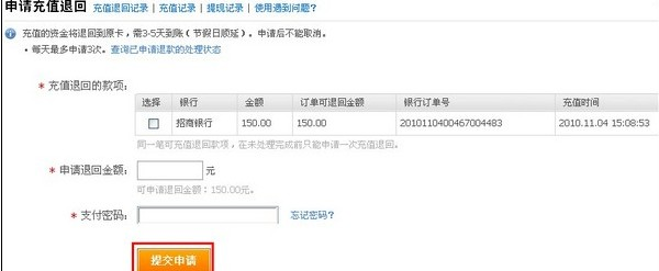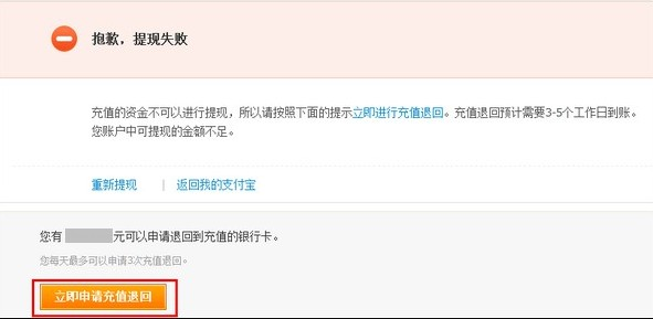 充值的金额如何取出? 大文 五月 11, 2016 账户资产 0 条评论 1511 围观 1 登录支付宝账户( www.alipay.com), 点击转出(提现) 2 申请提现,输入提现金额及支付密码;充值金额不允许提现,会提示申请充值退回 3 提现失败,点击【立即申请充值退回】,金额只能原路退回到您原来用于充值的银行卡中 4 在需要原路退回的银行订单号上打上勾,输入需要原路退回的金额和支付密码 5 申请充值退回提交成功起第二天开始算